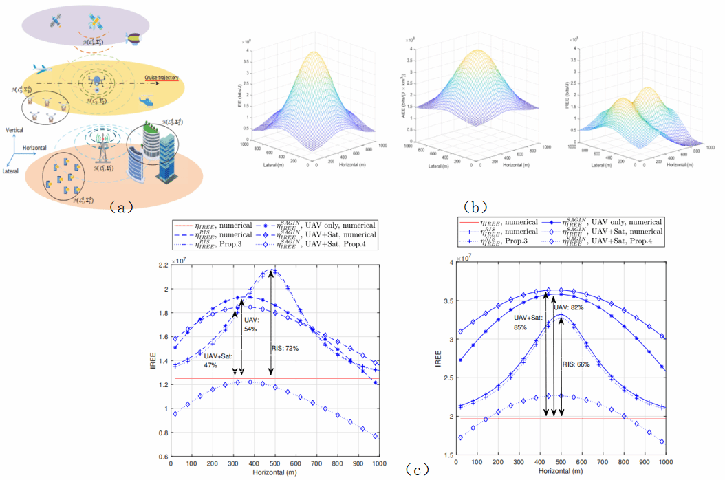 (a)6G網(wǎng)絡(luò)場景示意圖(b)能量效率,區(qū)域能量效率以及集成相對能效的空間分布比較 (c) 在非均勻地面流量(左)和非均勻SAGIN流量(右)下, RIS以及SAGIN技術(shù)的IREE性能
