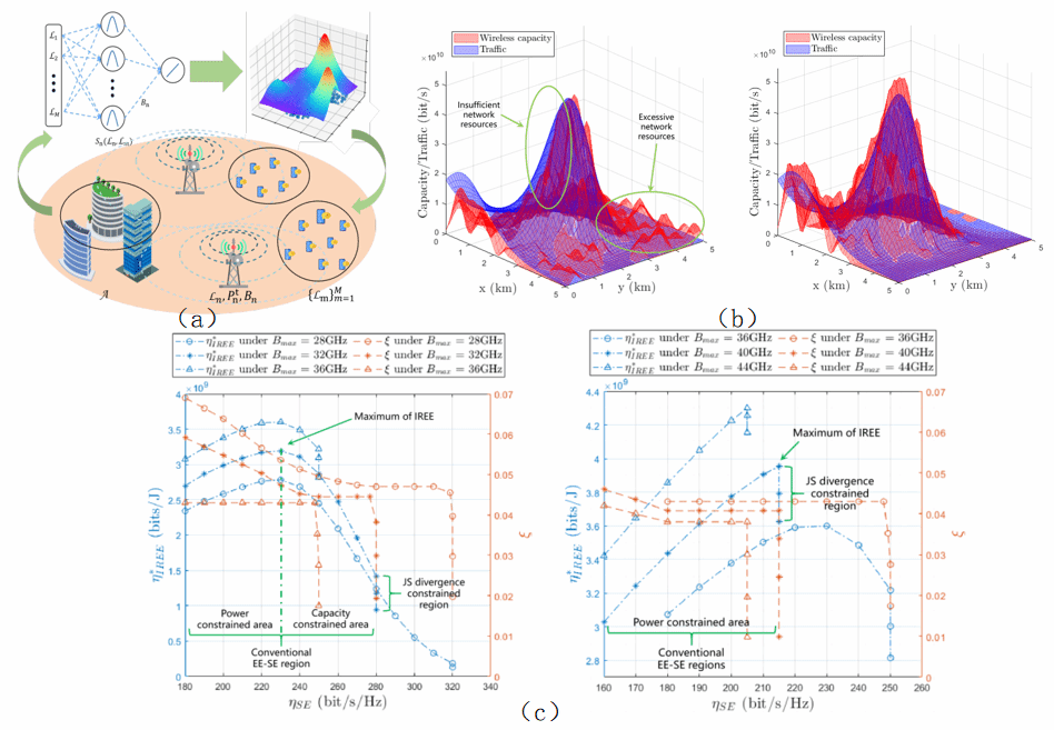 (a)6G無線網(wǎng)絡(luò)場景,可以將各個(gè)基站看做徑向基神經(jīng)元,對無線流量進(jìn)行擬合;(b) 傳統(tǒng)EE最大化方案(左) vs IREE最大化方案(右)下的網(wǎng)絡(luò)容量和流量分布,可以看出面向IREE的設(shè)計(jì)能夠有效降低資源浪費(fèi);(c) 不同帶寬限制下的集成相對能效-譜效折中關(guān)系